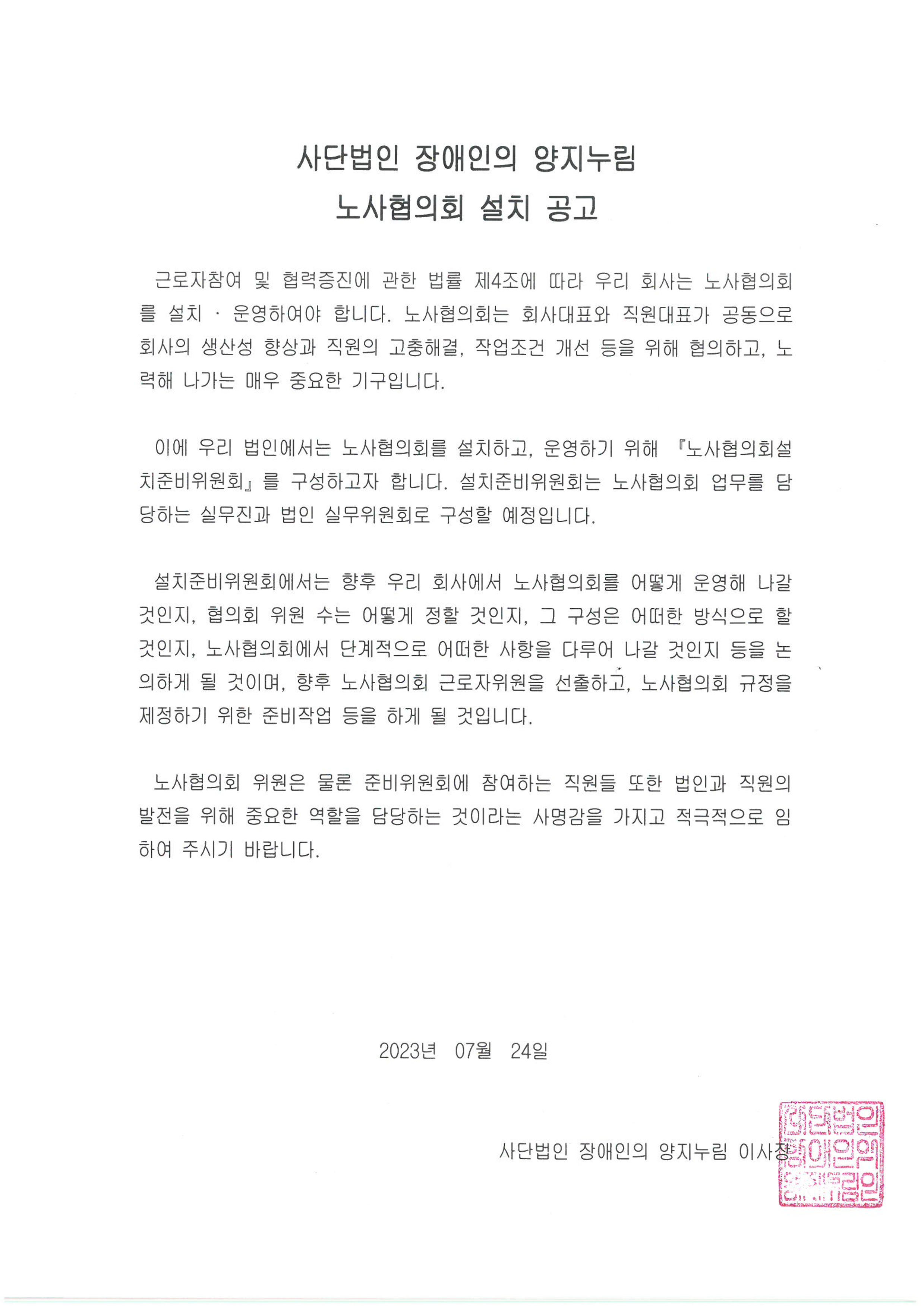 (사)장애인의 양지누림 노사협의회 근로자위원 보궐선거 당선인 결정공고
