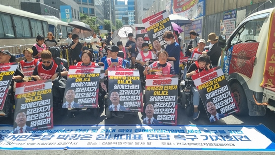 전국장애인차별철폐연대가 오전 11시 더불어민주당 당사 앞에서 2024년 장애인권리예산 쟁취 및 21대 국회 장애인권리입법 제정 촉구를 위한 더불어민주당 박광온 원내대표에게 면담 요청 기자회견을 개최했다.